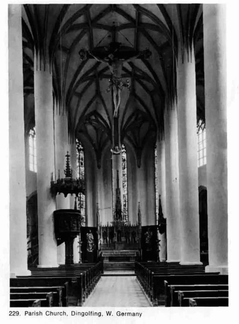 One column bisects the nave at the end of the Late Gothic parish church at Dingolfing (229), a hall-type church, but the juxtaposition of the central bay and window behind, which evolves from the complex vaulting above, resolve the original duality. (p 95-96)